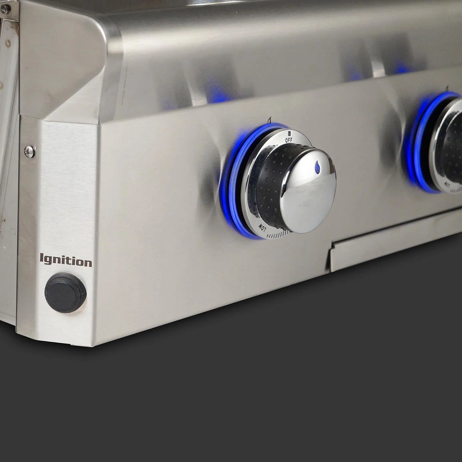 The rounded hood and contoured face feature a satin finish that offers an attractive look to any outdoor kitchen and come with an analog thermometer with a polished bezel mounted on the front. The grill features vaporizer panels for even heat distribution and an easy-to-use drip collection system. Solid brass valves are used for precise temperature control and extended life. A 120-volt power source is required for this model.