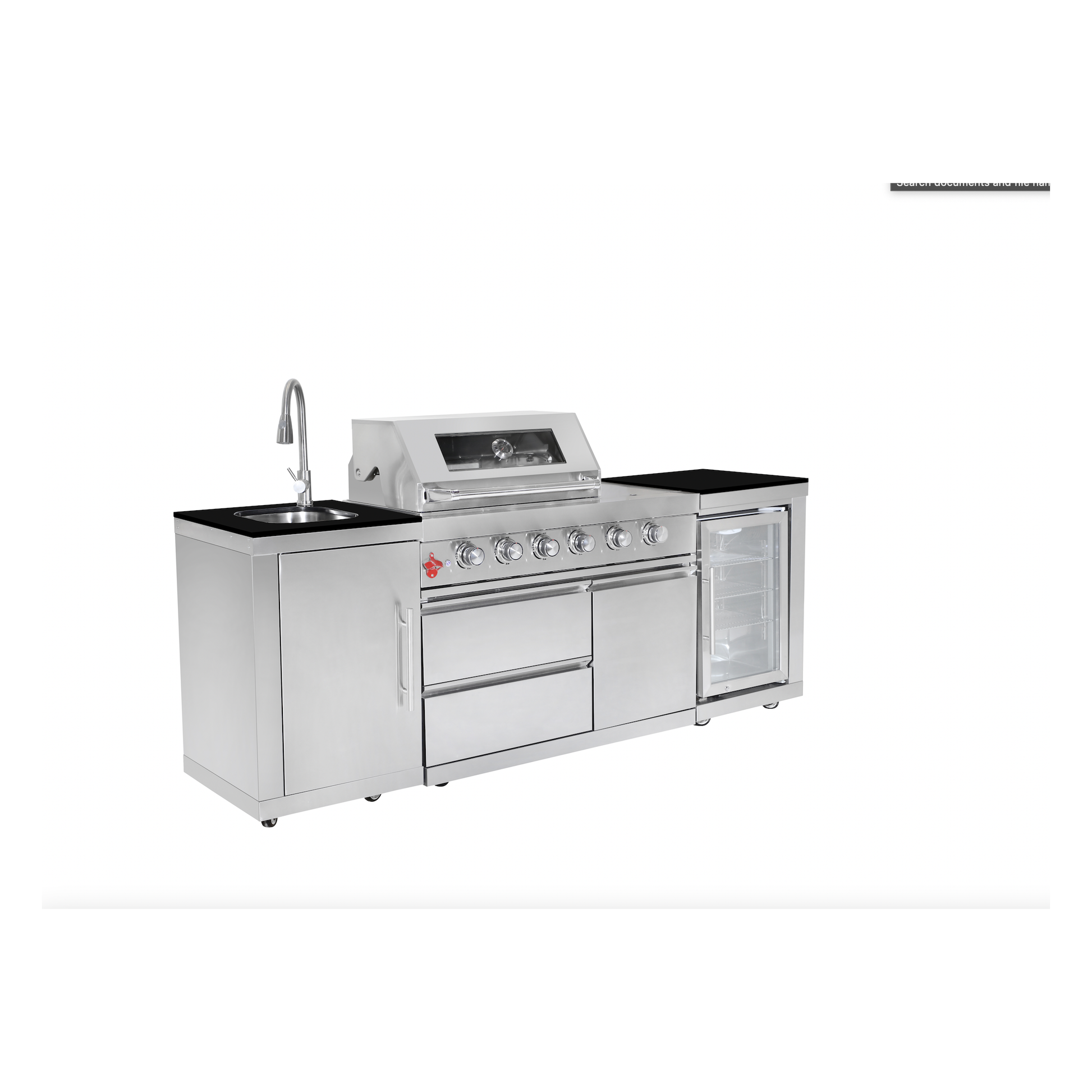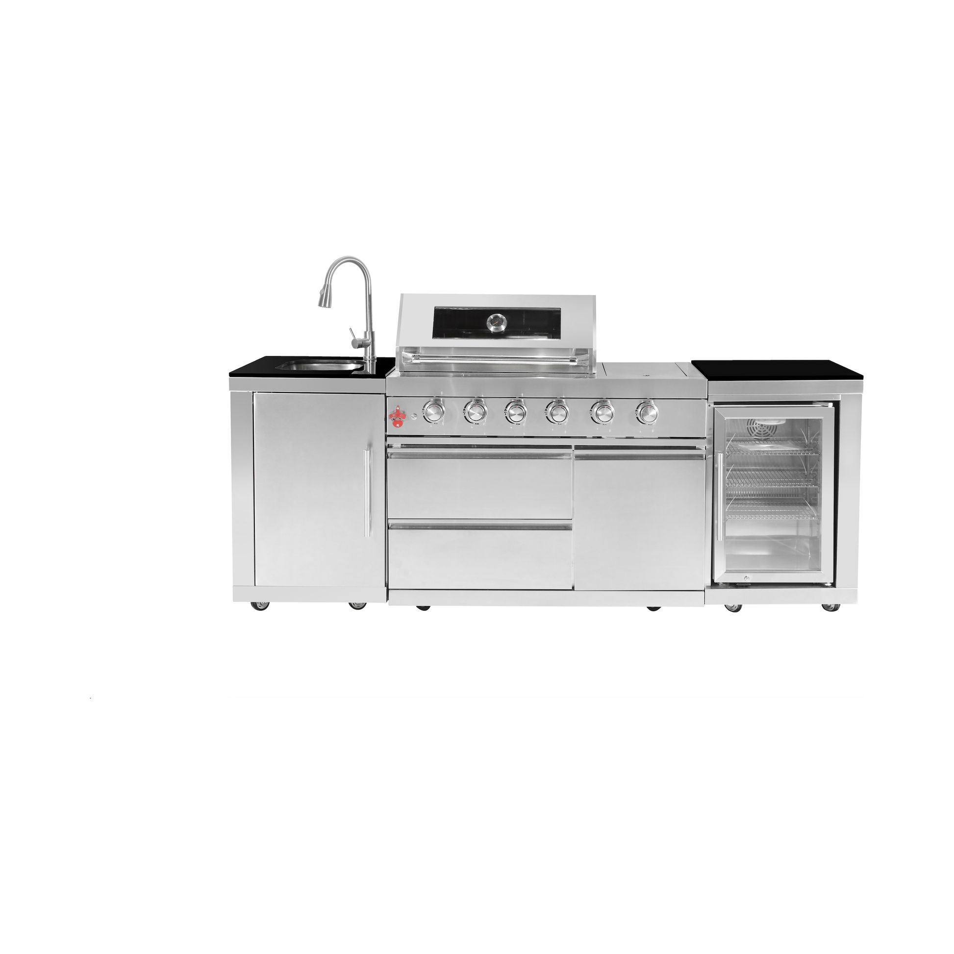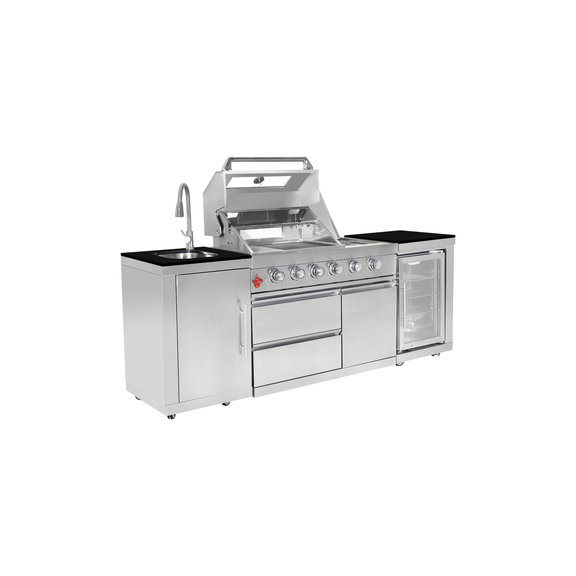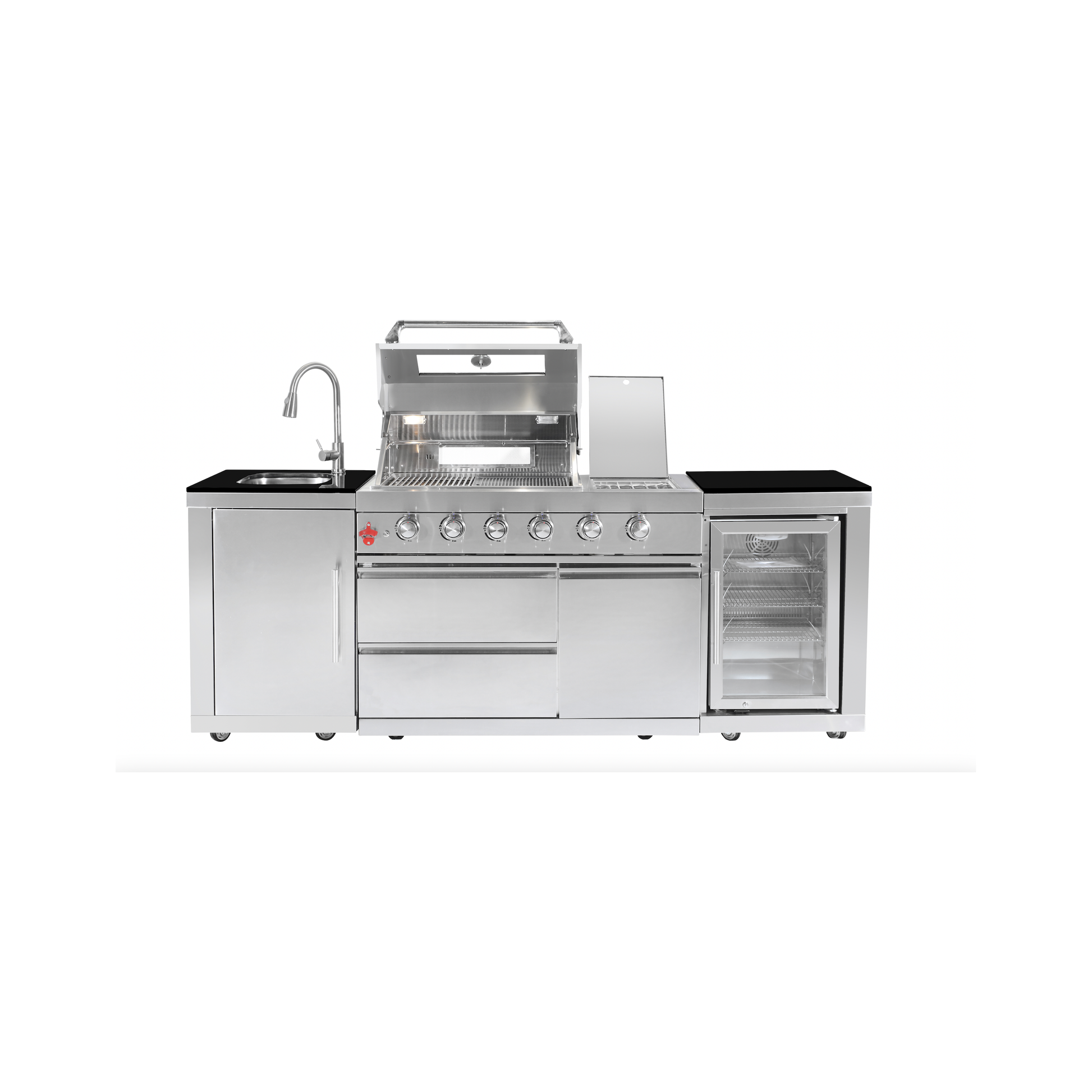 Crafted for all climates, the BBQ includes primary burners, a side cook burner, a rear rotisserie infrared burner, and a stainless steel sink with a faucet. The unit boasts weatherproof powder-coated black doors, while the base offers ample storage with large cupboards and multiple centered doors. It also includes a large-capacity locking fridge with blue LED backlighting to elevate your space.