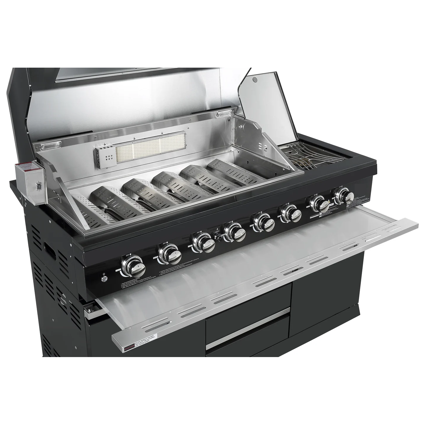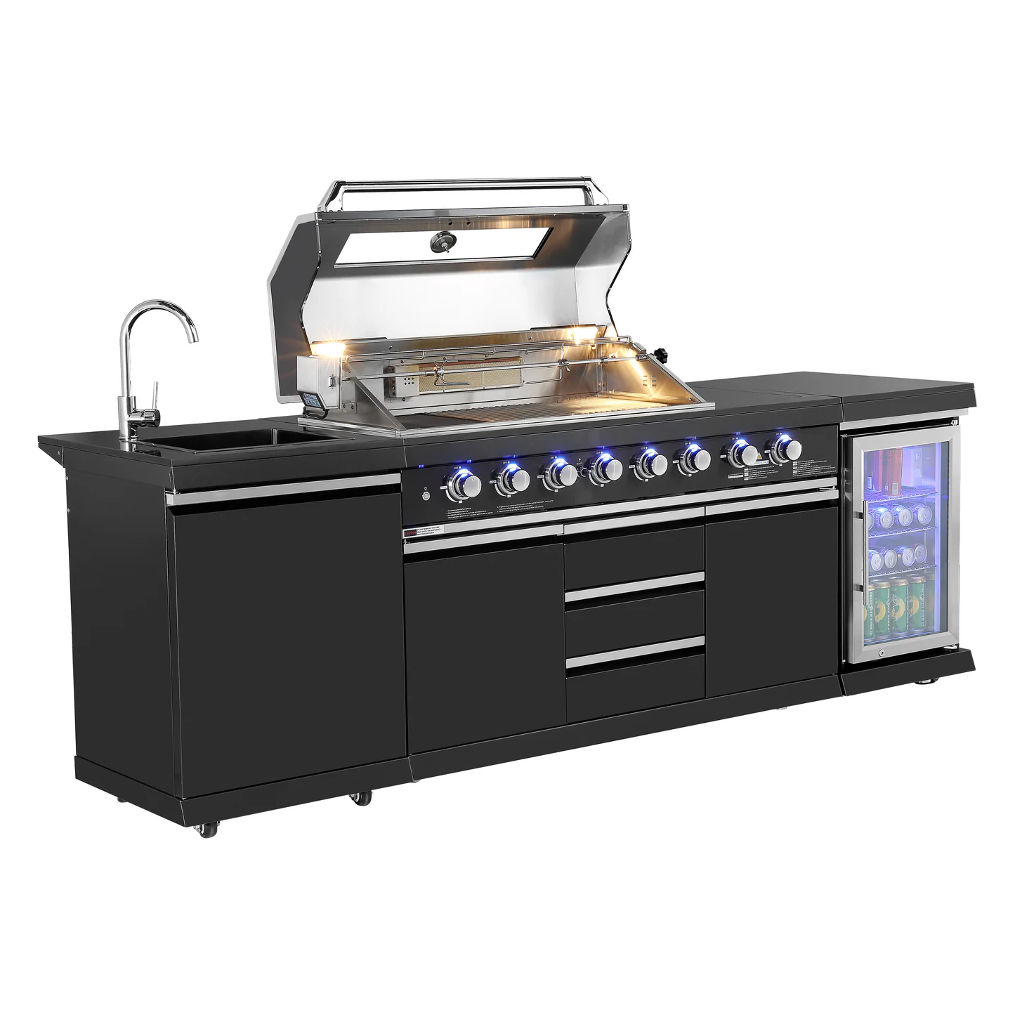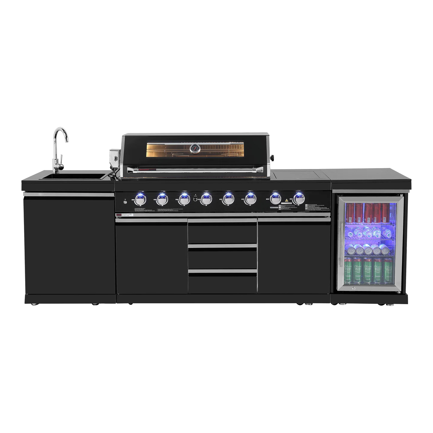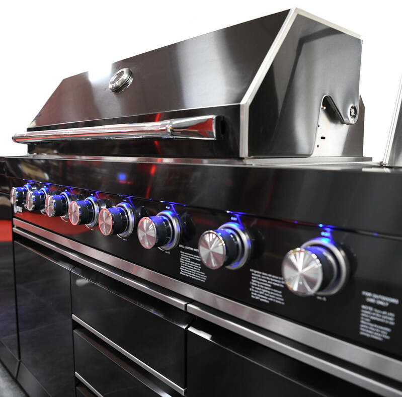 The PINNACLE 805 Black Stainless Steel BBQ Grill Island with Fridge offers a sleek and durable option for outdoor cooking and entertaining. With a 6-burner gas grill made from 304 black stainless steel, this grill island provides professional-grade quality and style. Enjoy grilling with ease while also keeping drinks and refreshments readily available. Upgrade your outdoor space with this high-performance and modern grill island.