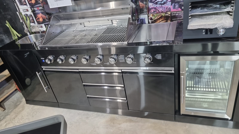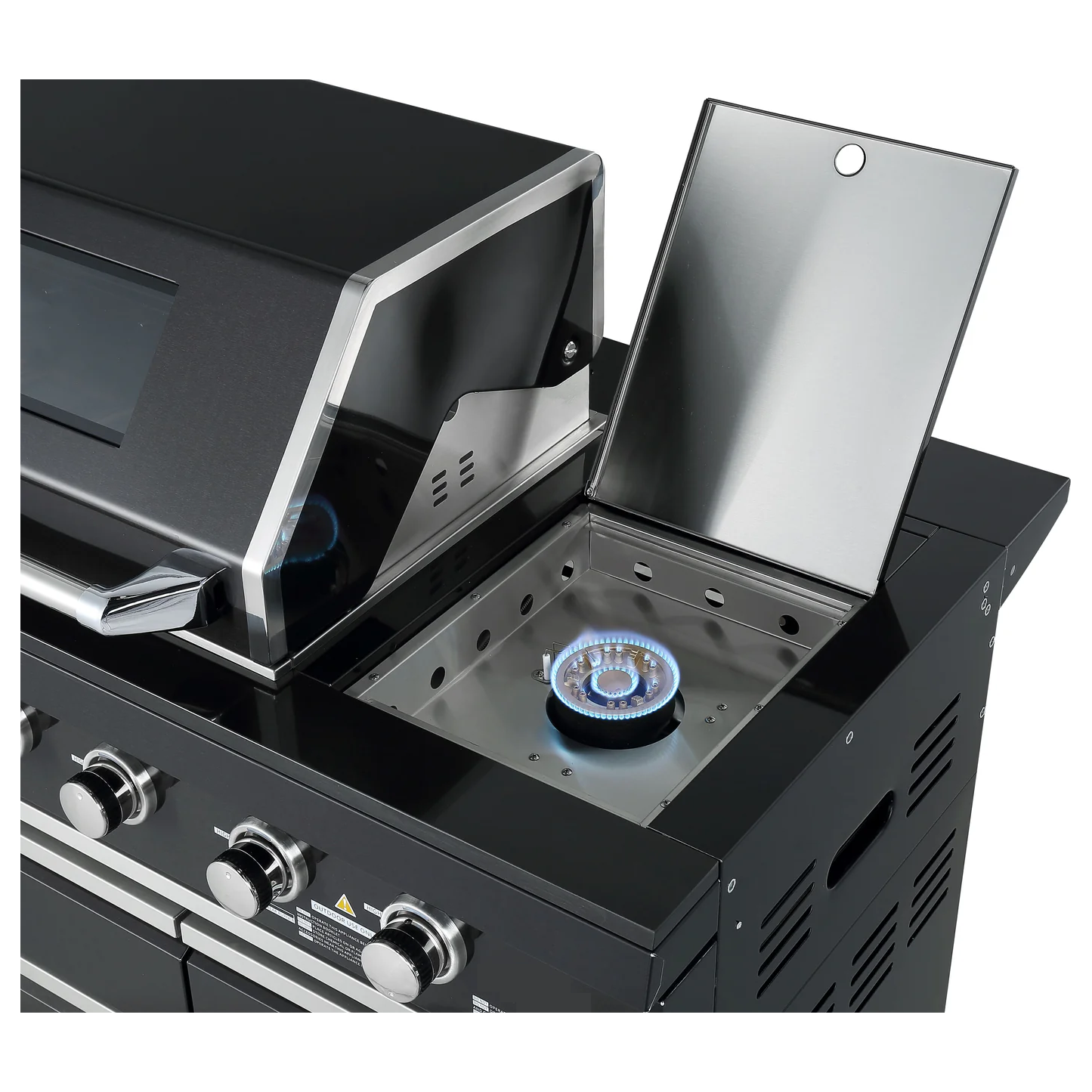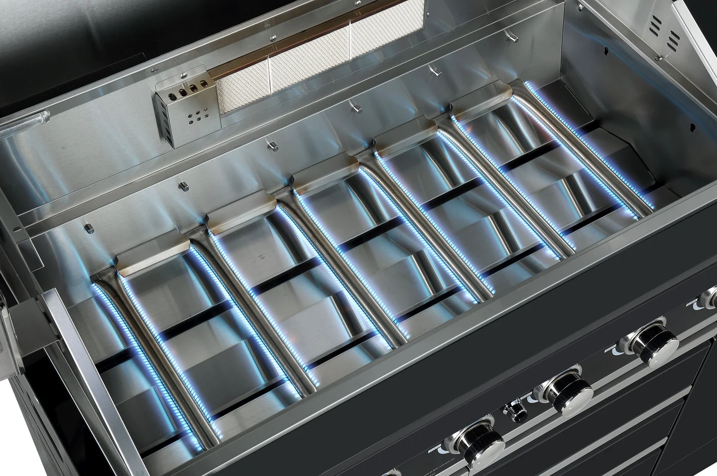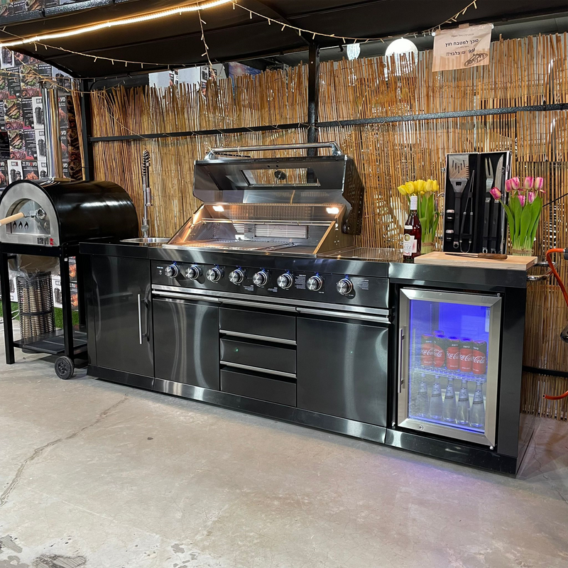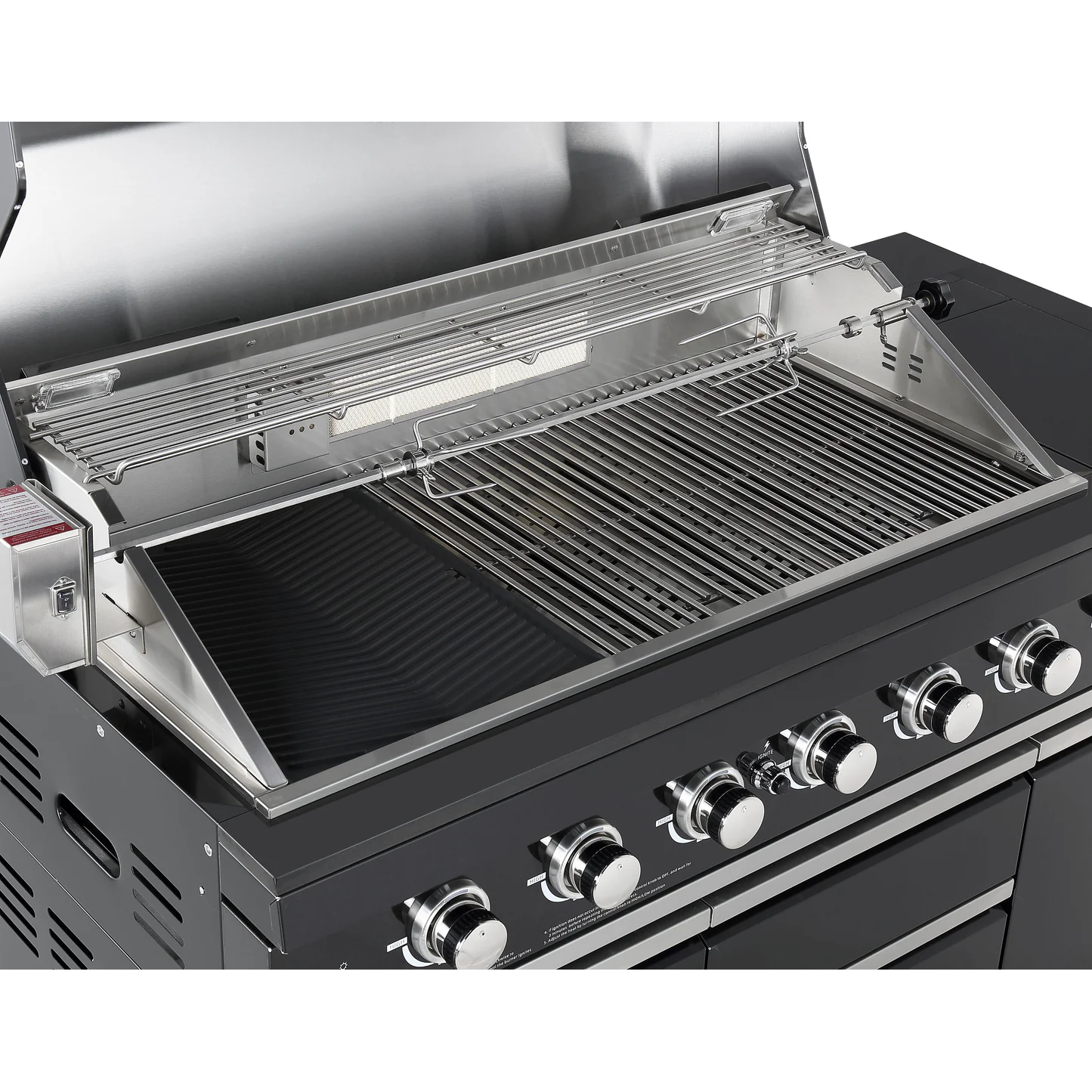 The PINNACLE 805 Black Stainless Steel BBQ Grill Island with Fridge offers a sleek and durable option for outdoor cooking and entertaining. With a 6-burner gas grill made from 304 black stainless steel, this grill island provides professional-grade quality and style. Enjoy grilling with ease while also keeping drinks and refreshments readily available. Upgrade your outdoor space with this high-performance and modern grill island.