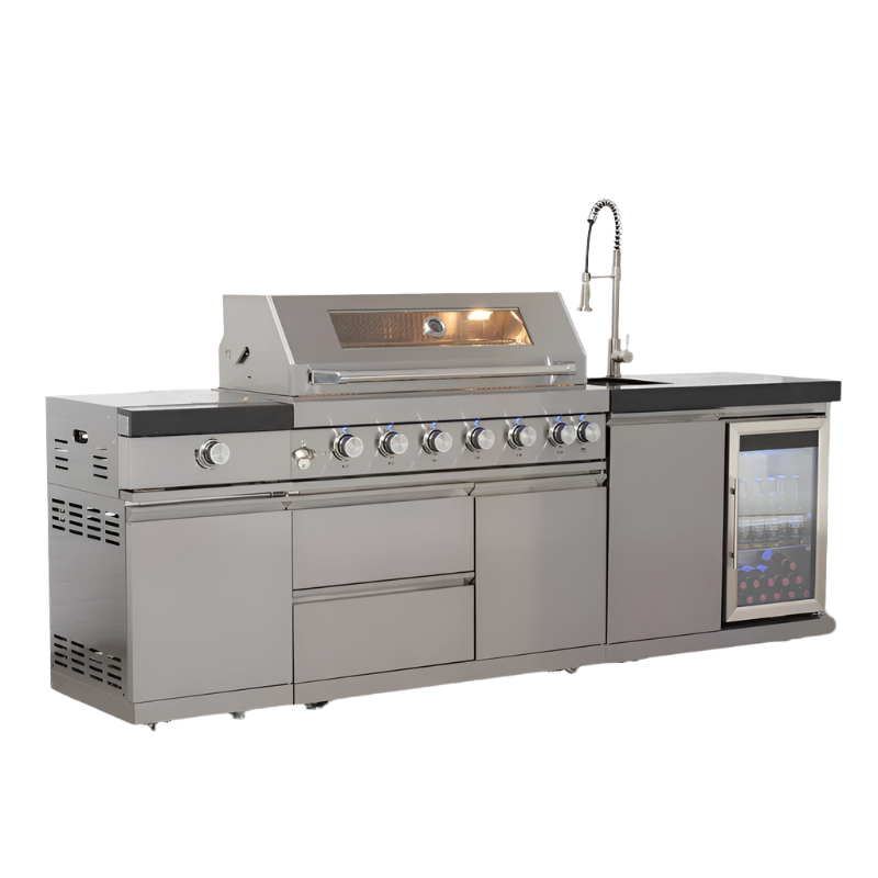 The PINNACLE 805 Stainless Steel BBQ Grill Island with Beverage Center offers a sleek and durable option for outdoor cooking and entertaining. With a 6-burner gas grill made from 304 stainless steel, this grill island provides professional-grade quality and style. Enjoy grilling with ease while also keeping drinks and refreshments readily available. Upgrade your outdoor space with this high-performance and modern grill island.