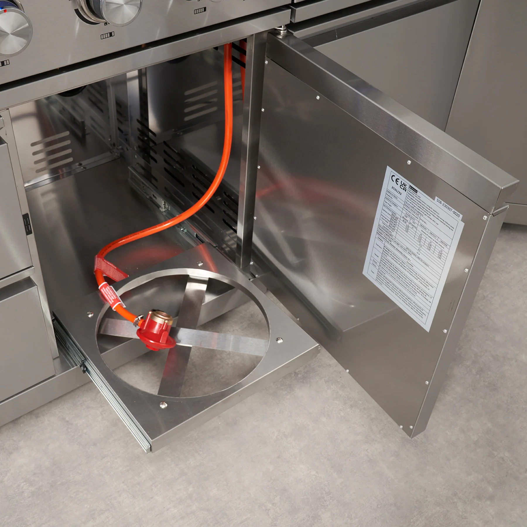 - Propane tank pull-out for easy access