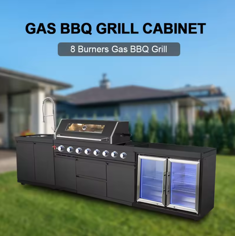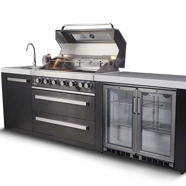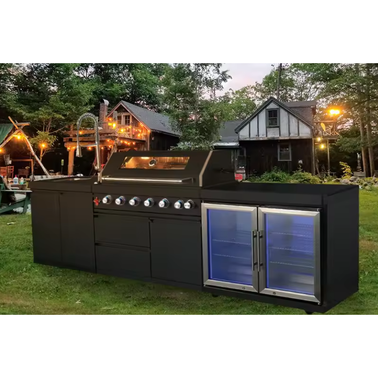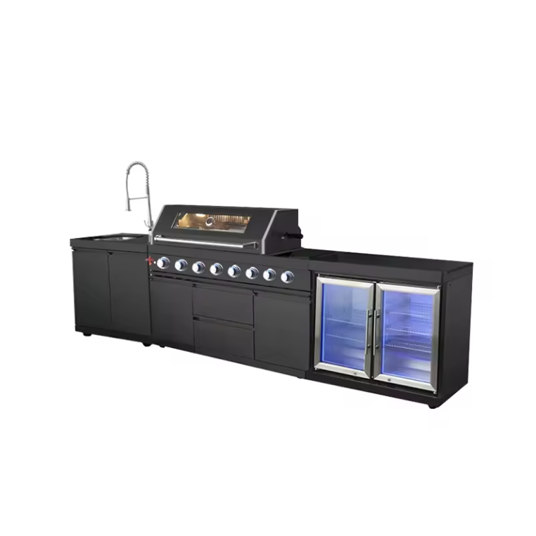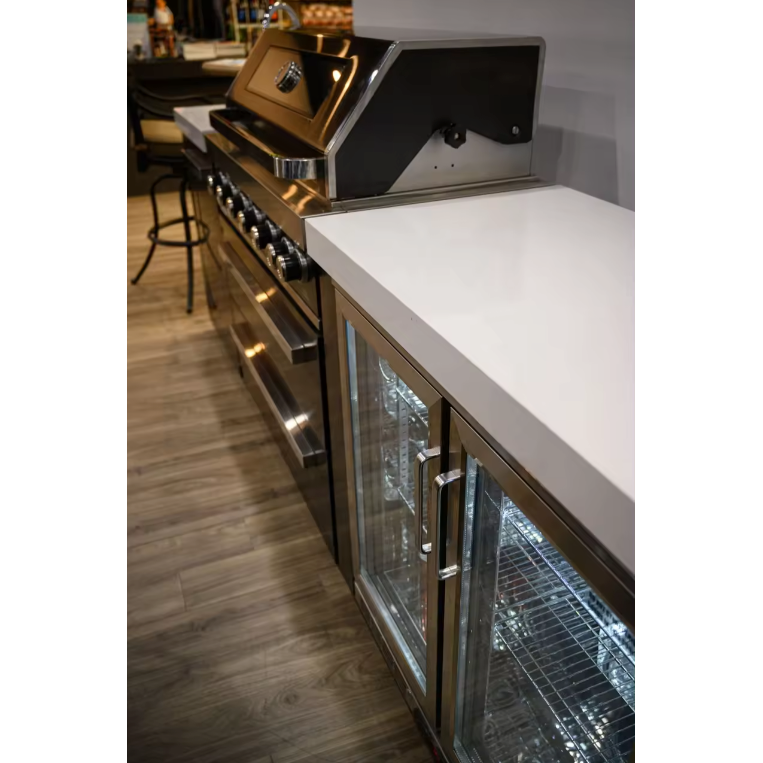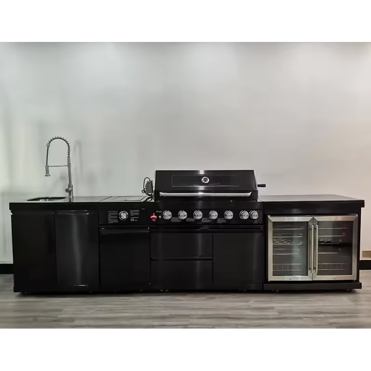 The PINNACLE 805 Deluxe Black Stainless Steel BBQ Grill Island with Beverage Center offers a sleek and durable option for outdoor cooking and entertaining. With a 6-burner gas grill made from 304 black stainless steel, this grill island provides professional-grade quality and style. Enjoy grilling with ease while also keeping drinks and refreshments readily available. Upgrade your outdoor space with this high-performance and modern grill island.