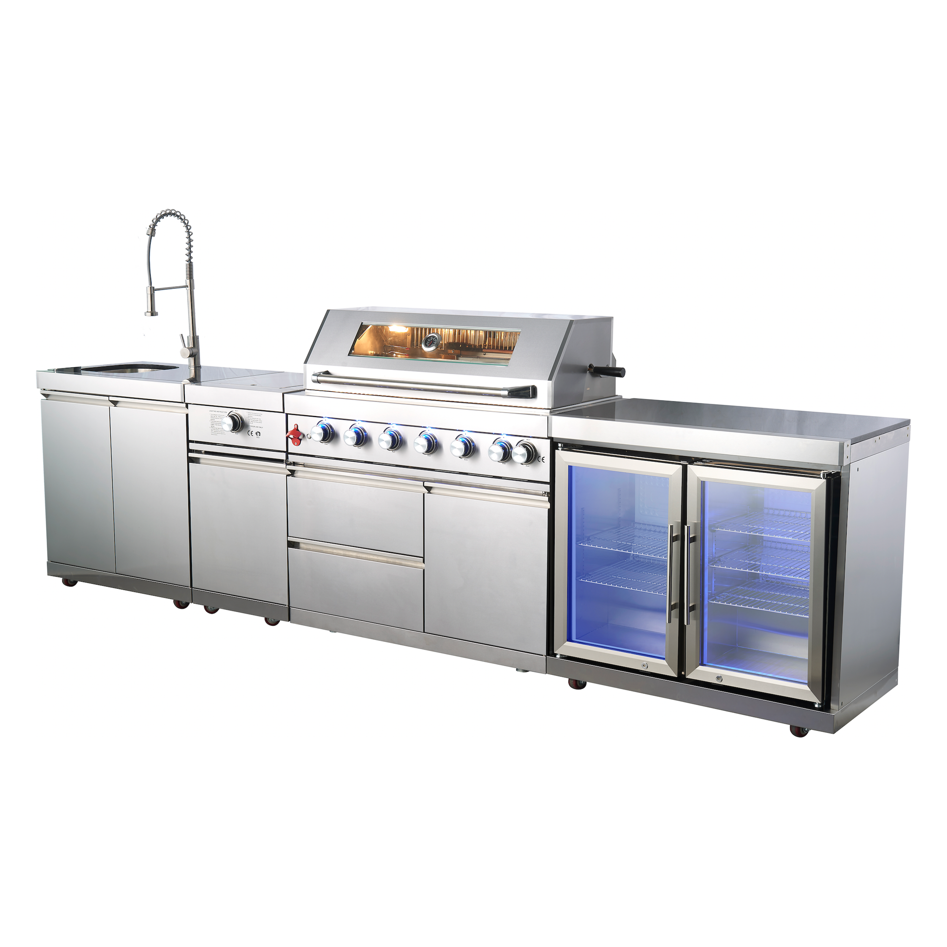 The PINNACLE 805 Deluxe Stainless Steel BBQ Grill Island with Double Fridge & Beverage Center offers a sleek and durable option for outdoor cooking and entertaining. With a 6-burner gas grill made from 304 stainless steel, this grill island provides professional-grade quality and style. Enjoy grilling with ease while also keeping drinks and refreshments readily available. Upgrade your outdoor space with this high-performance and modern grill island.